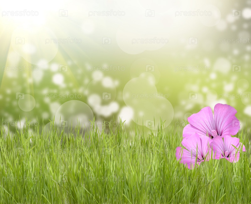 Зеленая трава, красивые цветы и солнце