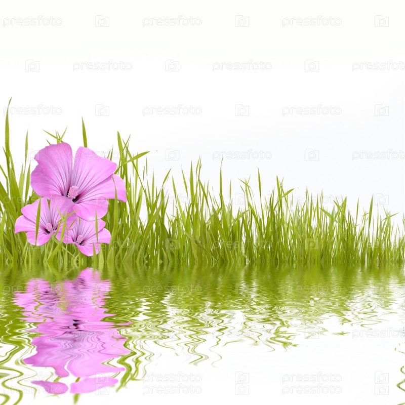 Зеленая трава и красивые цветы, отражающиеся в воде