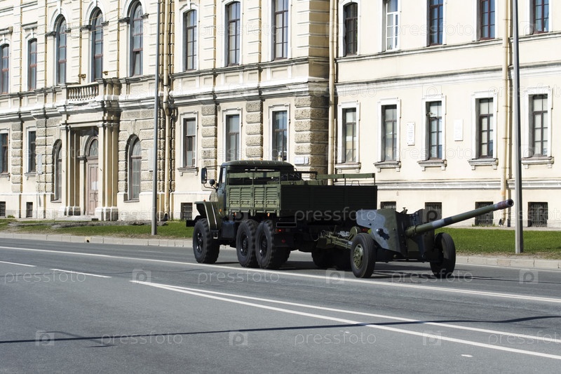 Военная машина с пушкой, едущая по городской улице