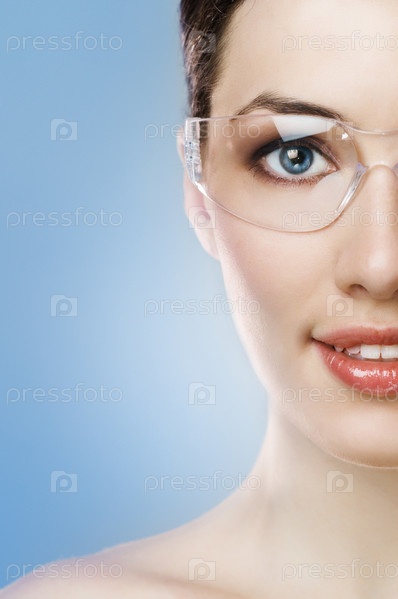 Красивая девушка в очках на голубом фоне