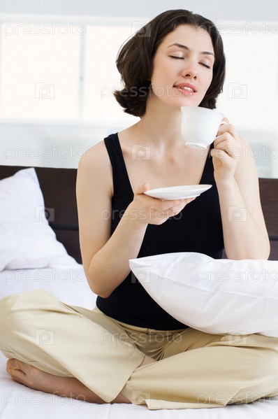 Женщина наслаждается кофе в постели