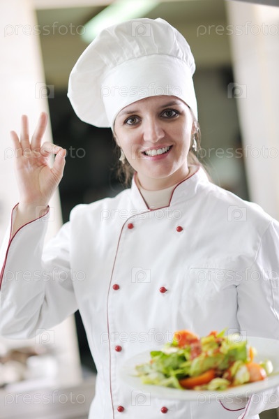 Молодая женщина шеф-повар готовит вкусную еду на кухне
