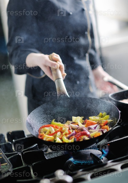 Молодая женщина шеф-повар готовит вкусную еду на кухне