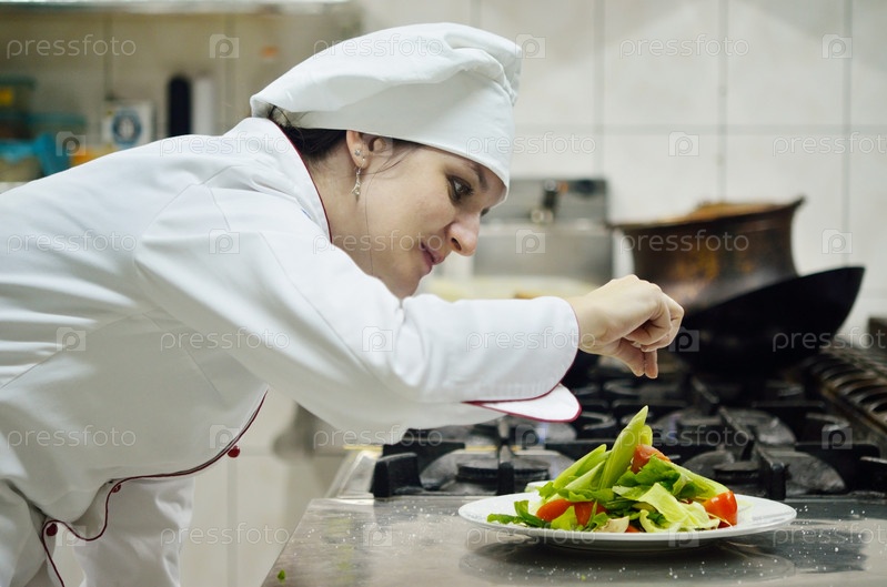 Молодая женщина шеф-повар готовит вкусную еду на кухне