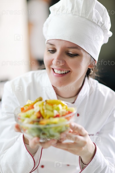 Молодая женщина шеф-повар готовит вкусную еду на кухне