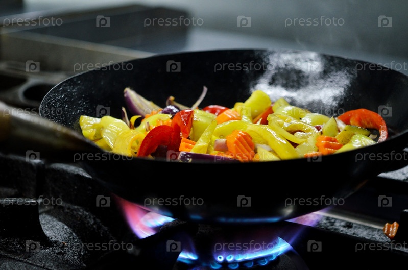 Мясо с овощами в сковороде на кухне ресторана