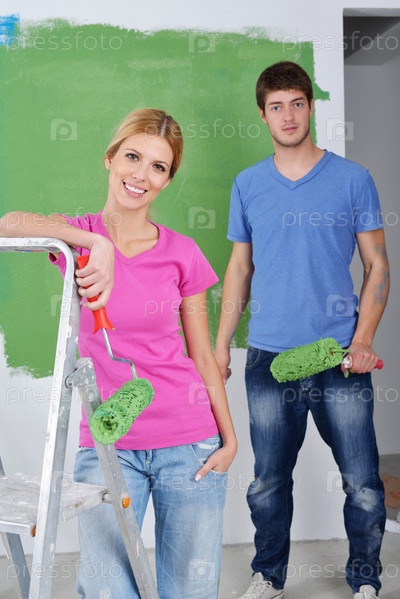 Счастливые молодые люди делают ремонт