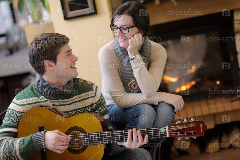 Счастливая пара отдыхает на диване у камина