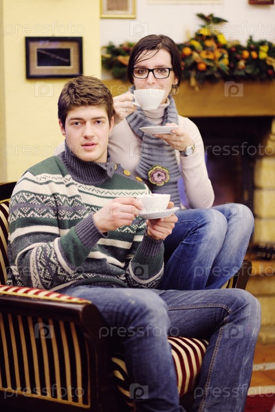 Счастливая молодая пара зимой у камина пьет кофе