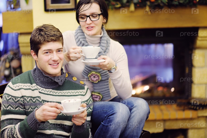 Счастливая молодая пара зимой у камина пьет кофе
