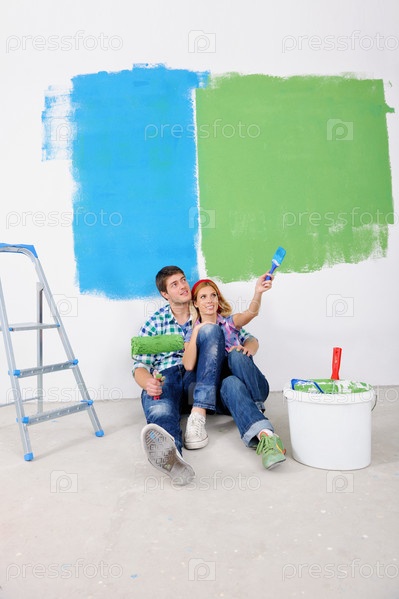Счастливая молодая пара делает ремонт