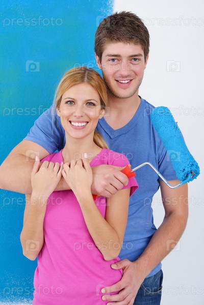 Счастливая молодая пара делает ремонт