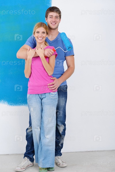 Счастливая молодая пара делает ремонт
