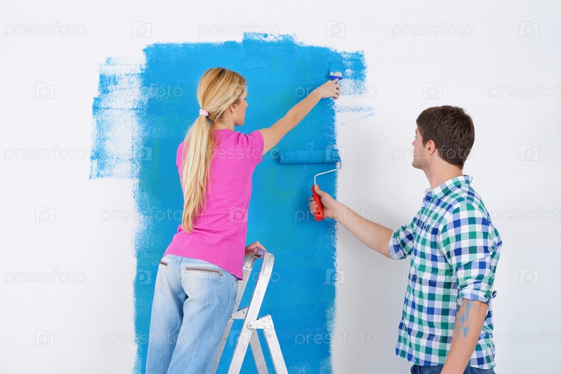 Счастливая молодая пара делает ремонт