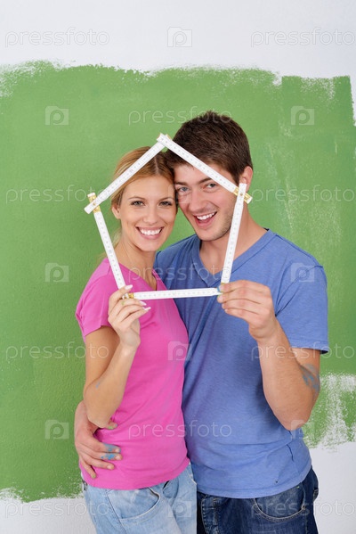 Счастливая молодая пара делает ремонт