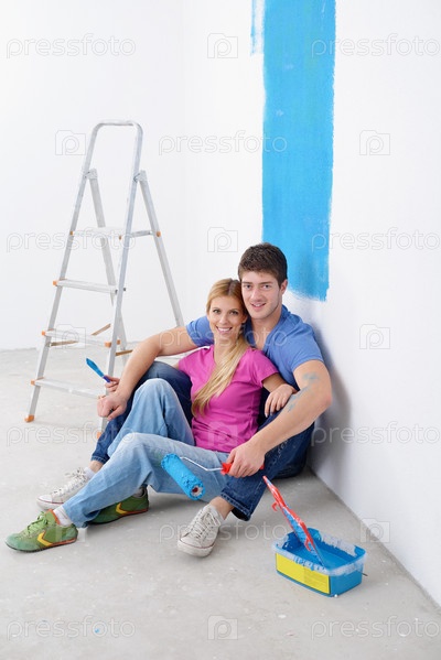 Счастливая молодая пара делает ремонт