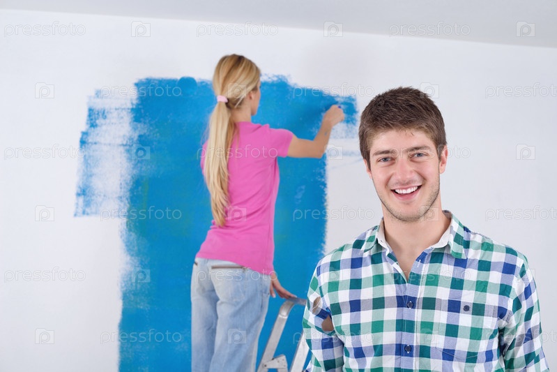 Счастливая молодая пара делает ремонт
