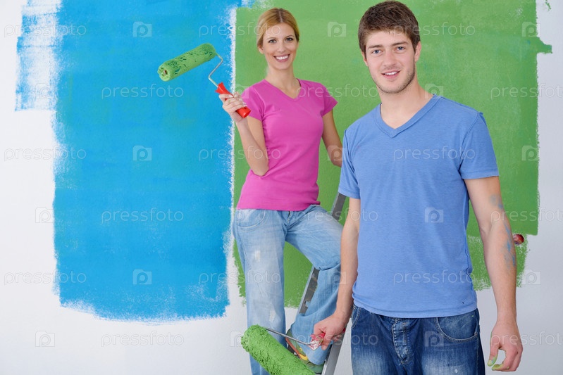 Счастливая молодая пара делает ремонт