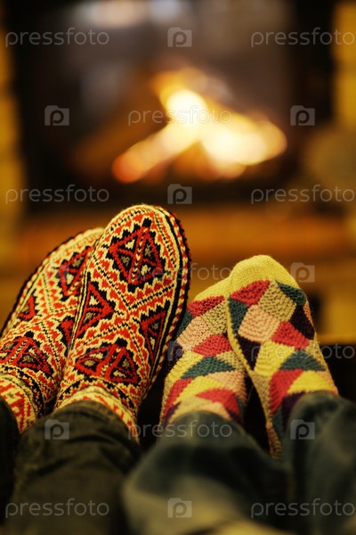 Счастливая пара зимой отдыхает на диване у камина