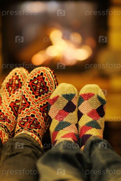 Счастливая пара зимой отдыхает на диване у камина