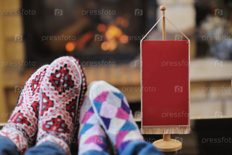 Счастливая пара зимой отдыхает на диване у камина