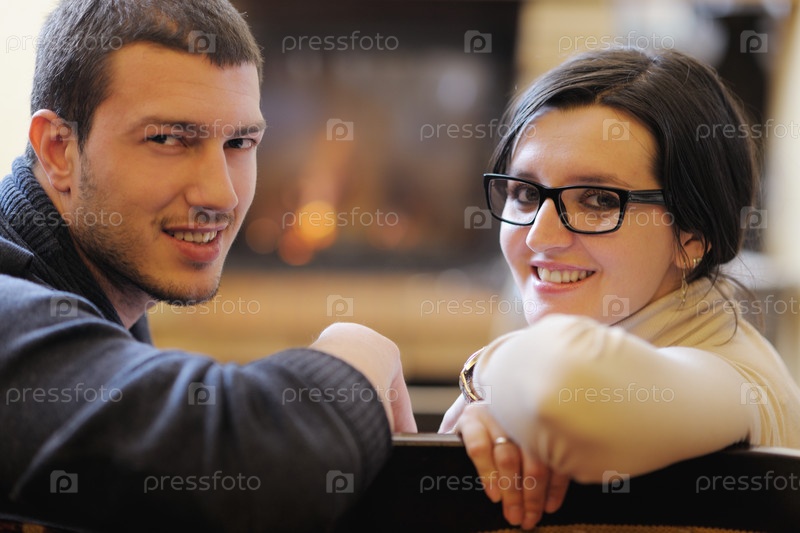 Счастливая молодая пара дома на диване перед камином