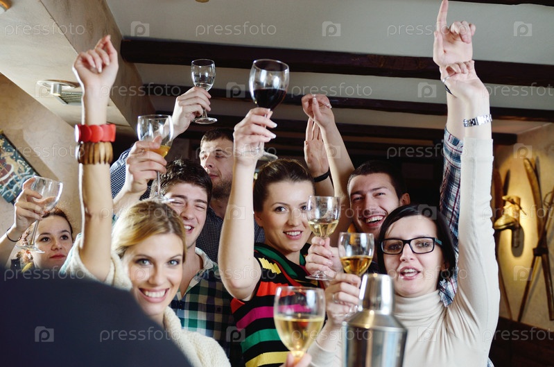 Счастливые молодые люди пьют вино в ресторане