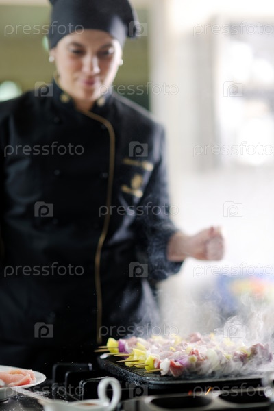 Молодая женщина шеф-повар готовит вкусную еду на кухне