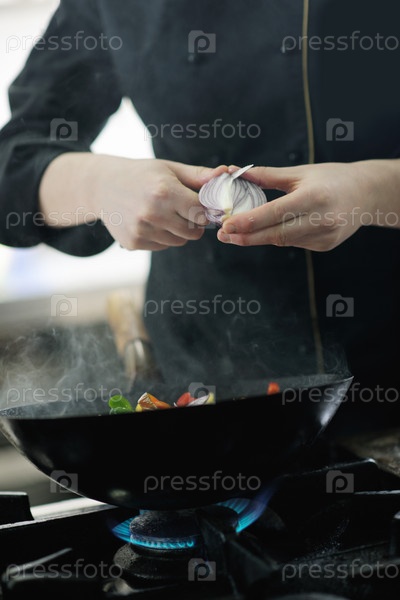 Молодая женщина шеф-повар готовит вкусную еду на кухне