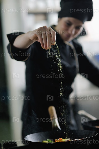 Молодая женщина шеф-повар готовит вкусную еду на кухне