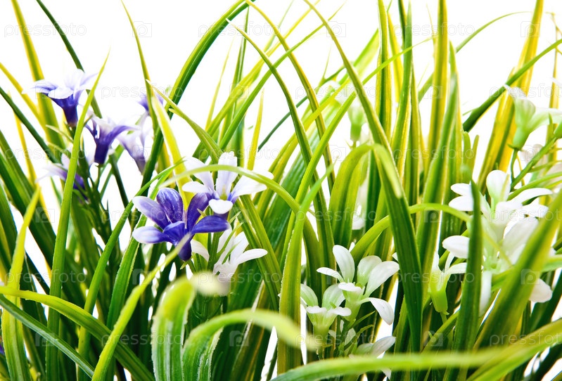 Зеленая трава и цветочки на белом фоне