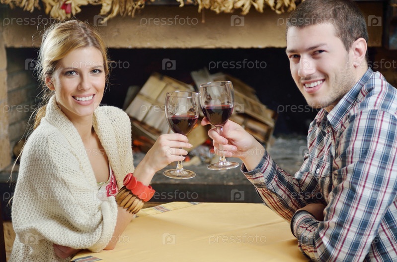 Счастливая пара пьет вино у камина