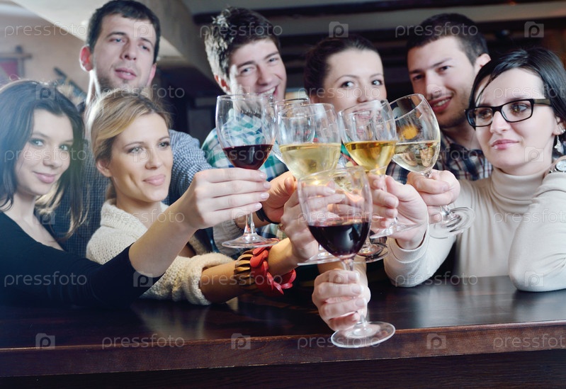 Молодые люди пьют вино в ресторане