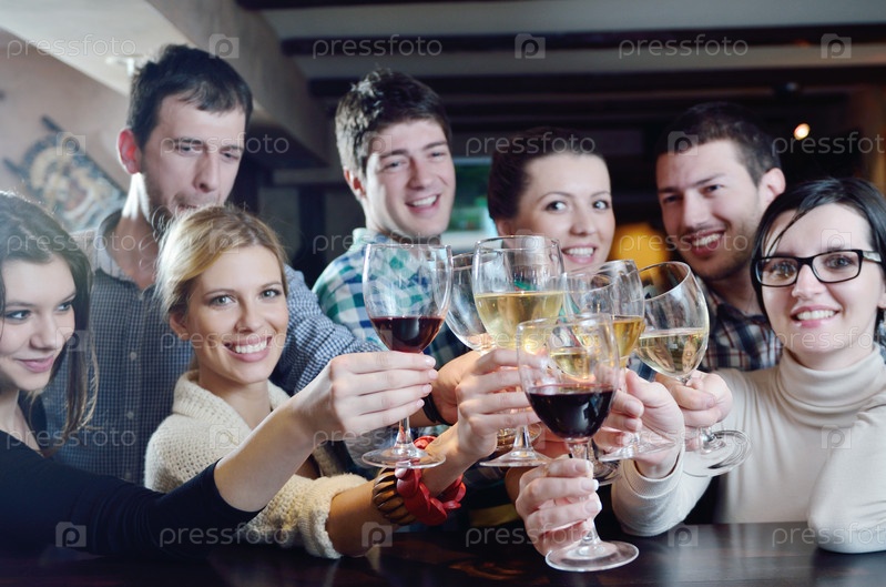 Молодые люди пьют вино в ресторане