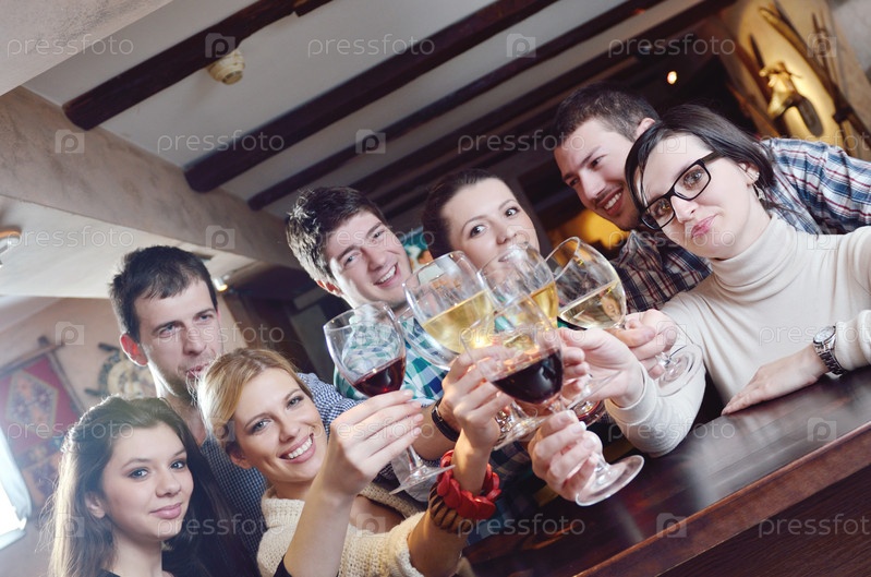 Молодые люди пьют вино в ресторане