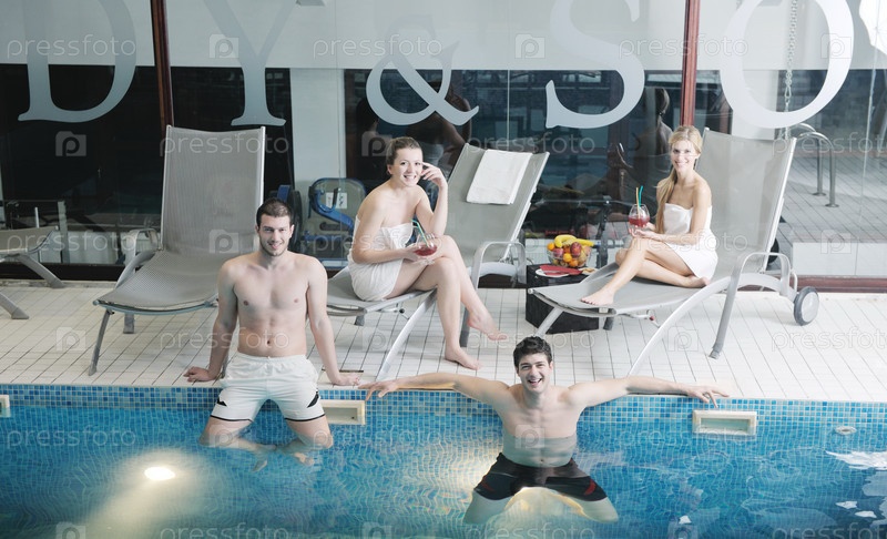 Счастливые молодые люди в бассейне в оздоровительном центре