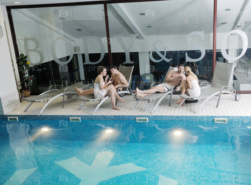 Счастливые молодые люди в бассейне в оздоровительном центре