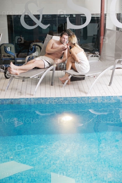 Счастливые молодые люди в бассейне в оздоровительном центре