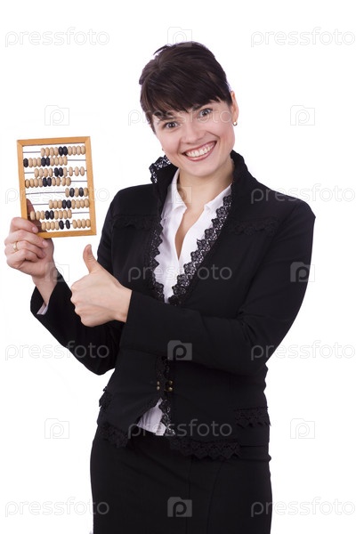 Портрет улыбающейся деловой женщины, держащей деревянный абак и показывает ОК
