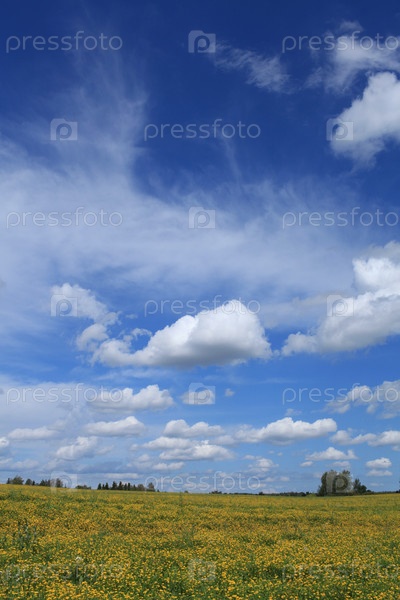 Поле с желтыми цветами на фоне голубого неба