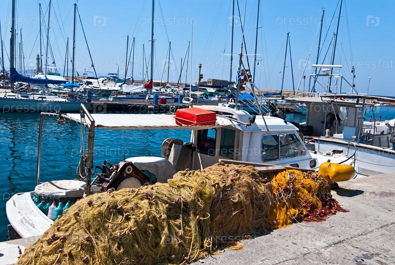 Традиционная греческая рыбацкая лодка, пришвартованная в порту города Ханья. Крит