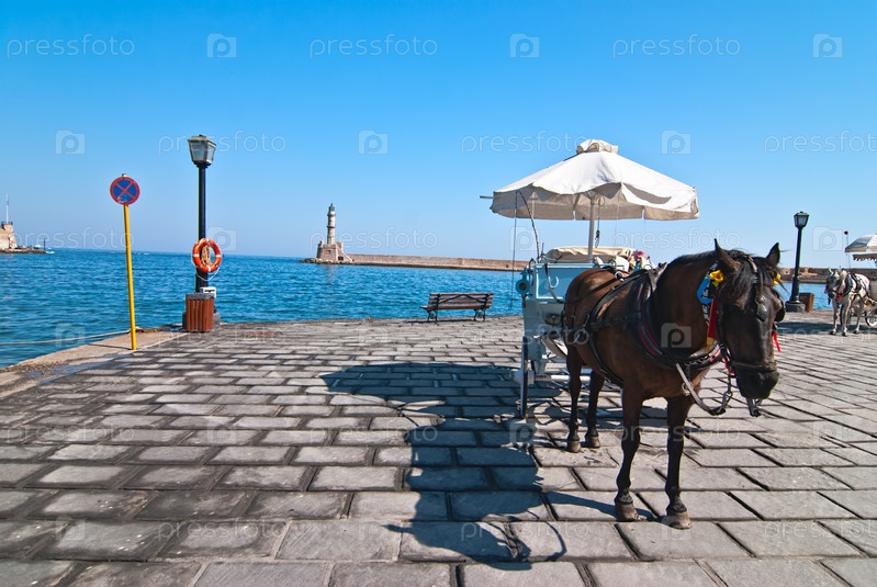 Повозка с лошадью на набережной города Ханья. Крит