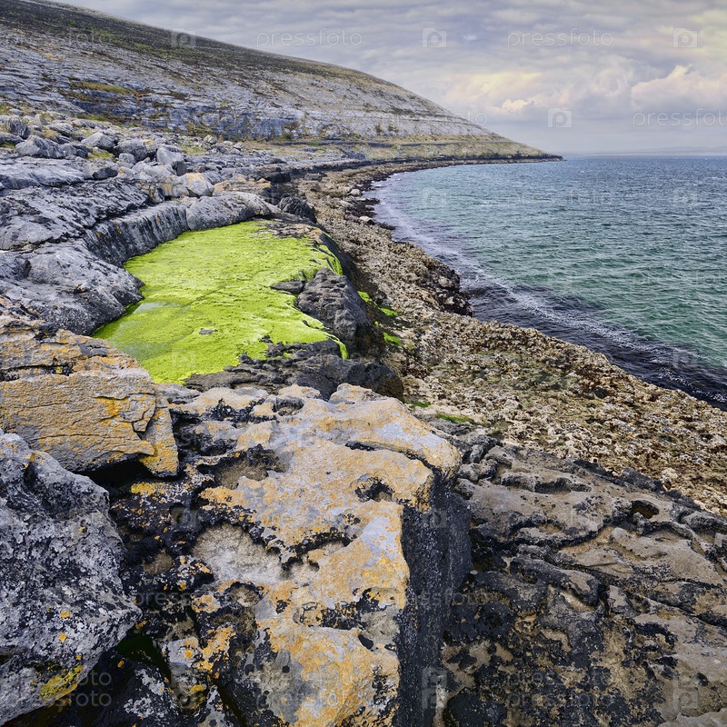 Драматический пейзаж. Скалы с зелеными водорослями во время отлива на побережье Атлантического океана вблизи Балливона, графство Клэр, Ирландия