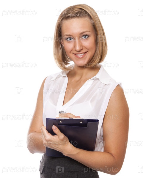 Красивая девушка-секретарь пишет в записной книжке