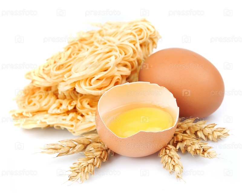 Свежая лапша с яйцами на белом фоне