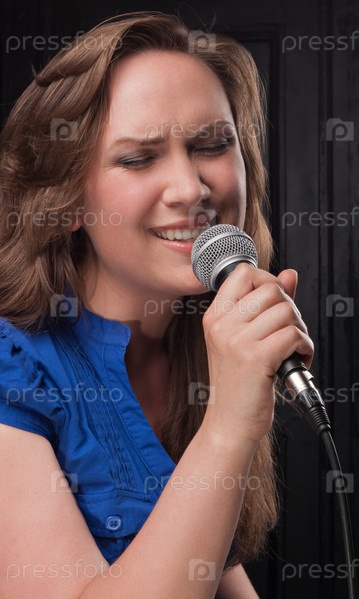 Женщина с микрофоном на темно-сером фоне