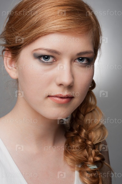 Портрет молодой красивой девушки на сером фоне