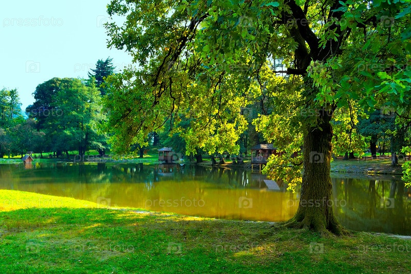 Тени деревьев на пруду в парке летом