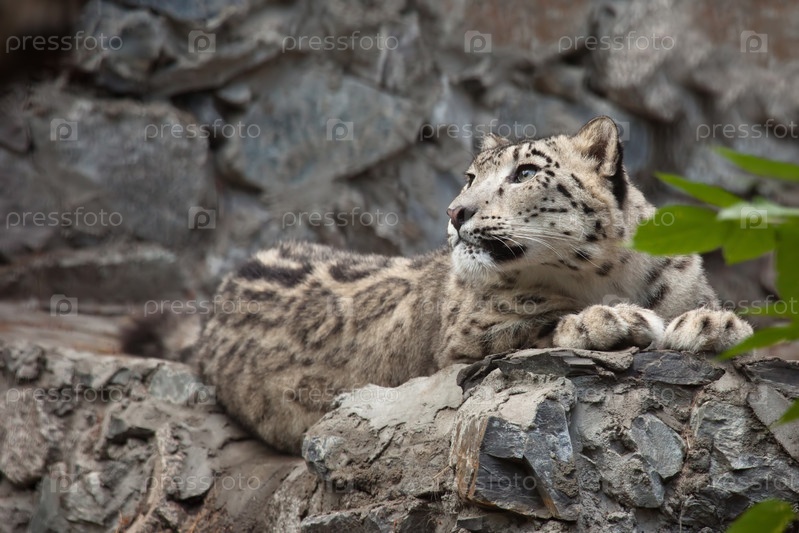 Снежный барс лежит на камнях