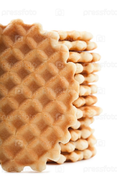 Стопка круглых золотистых вафель на белом фоне